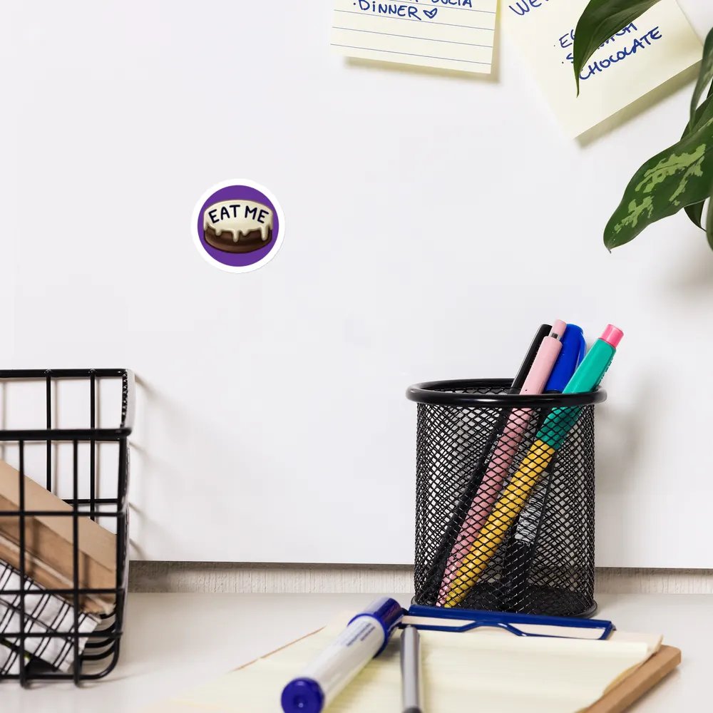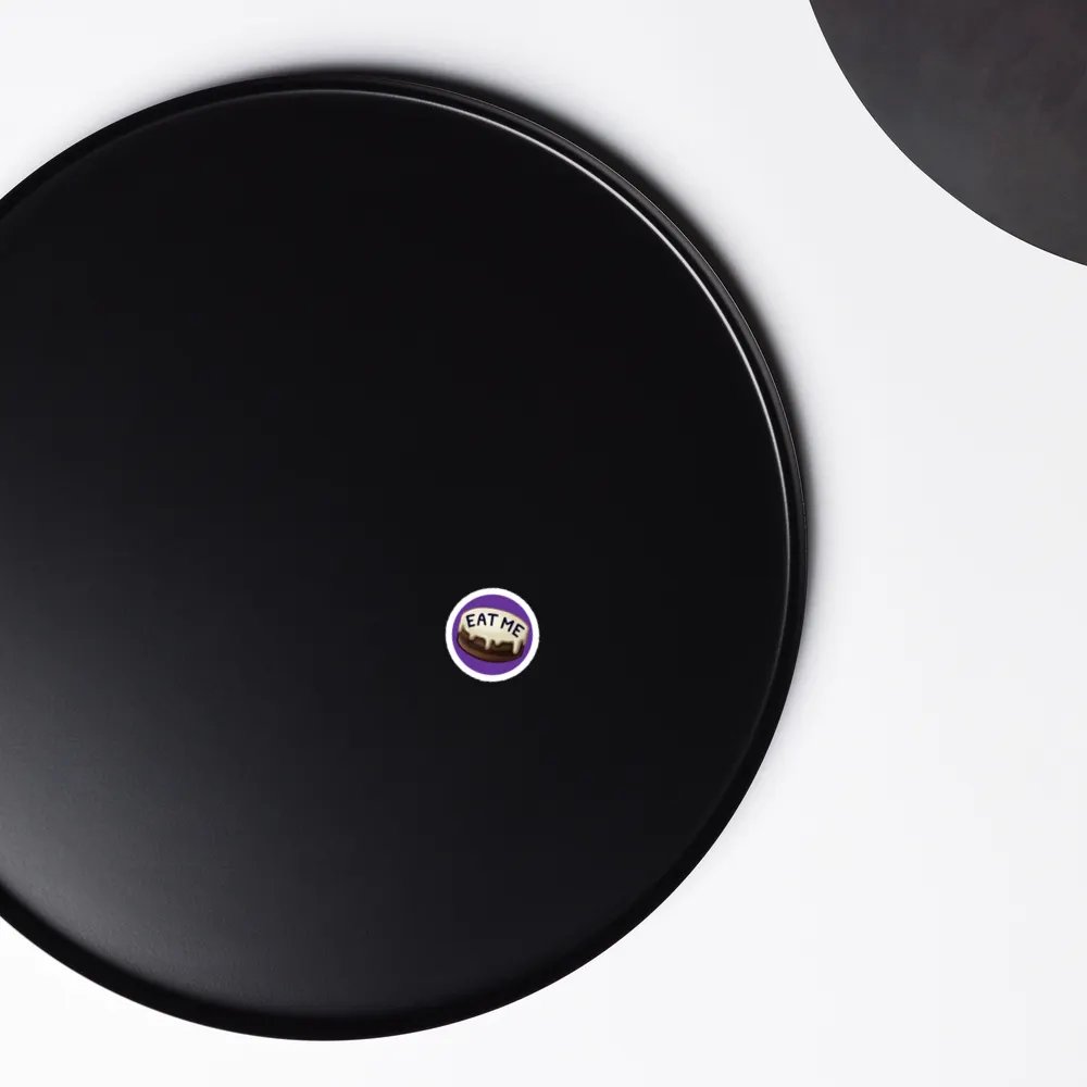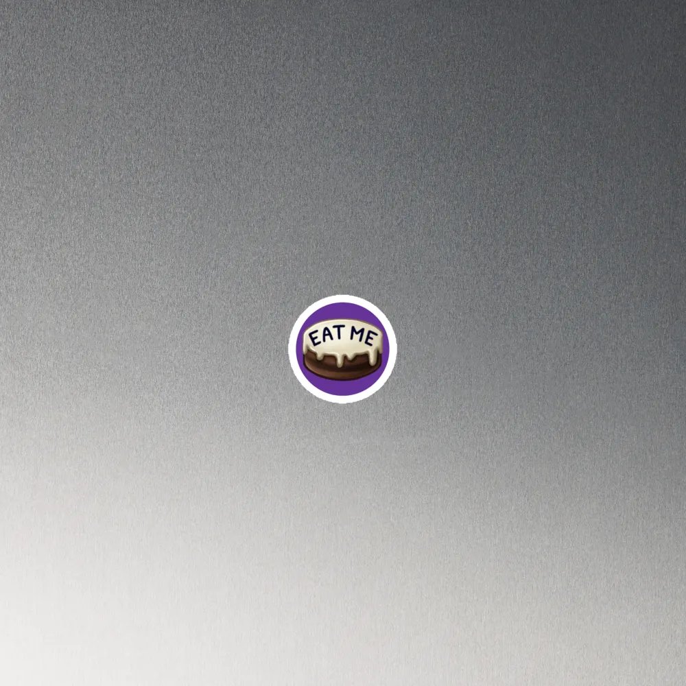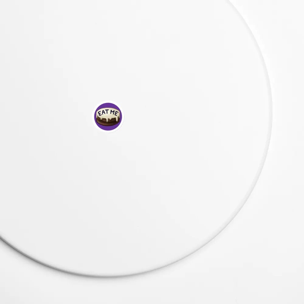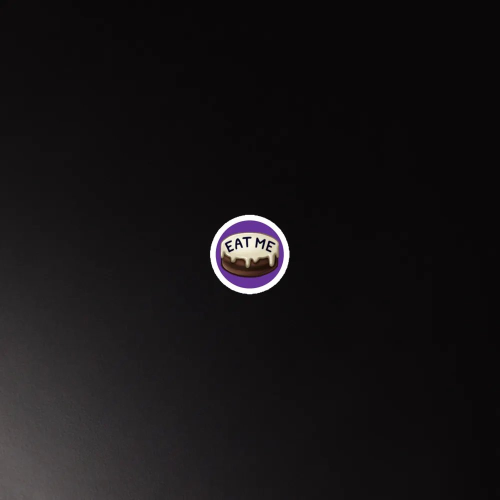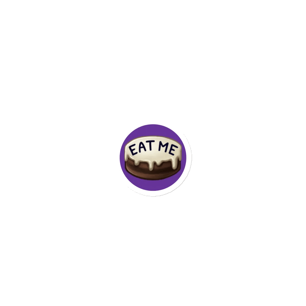 A chocolate cake, iced, with the words "EAT ME" in currants, on a Rebecca Purple (#663399) background.